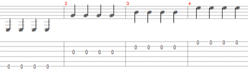 First play the thick string (6th) four times, then the third, second and first strings – each four times.