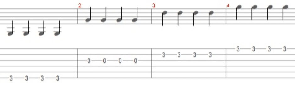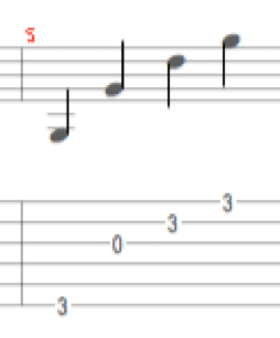 Note that this refers to which right hand finger you use. As the thumb covers three strings according to the Big Rule, you might also add which string the thumb is going to play. So you could describe the pattern above as T123 where the thumb plays the 6th string. It is important to note that if I say T123 that I mean thumb, first finger, second finger and third finger – not thumb, first string, second string, third string.